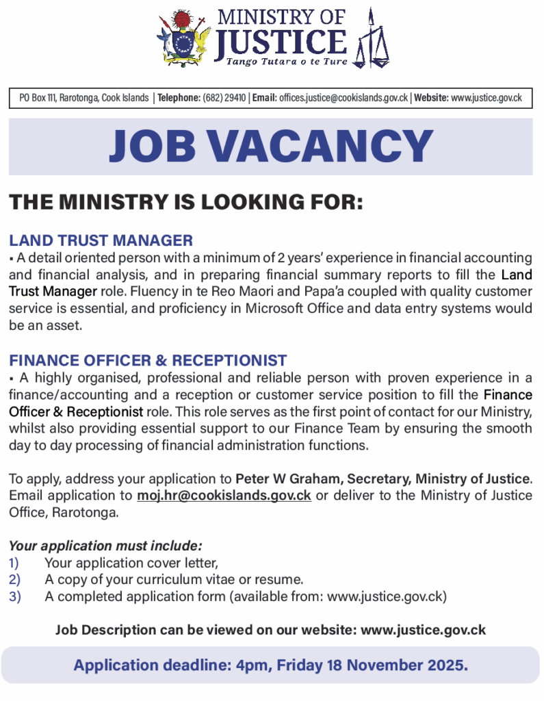 Categories Latest News Notices Vacancies Vacancy: Land Trust Manager & Finance Officer & Receptionist By Ministry of Justice Webmaster November 4, 2025 Job Description: Land Trust Manager | Job Description: Finance Officer & Receptionist DOWNLOAD APPLICATION FORM | APPLY ONLINE